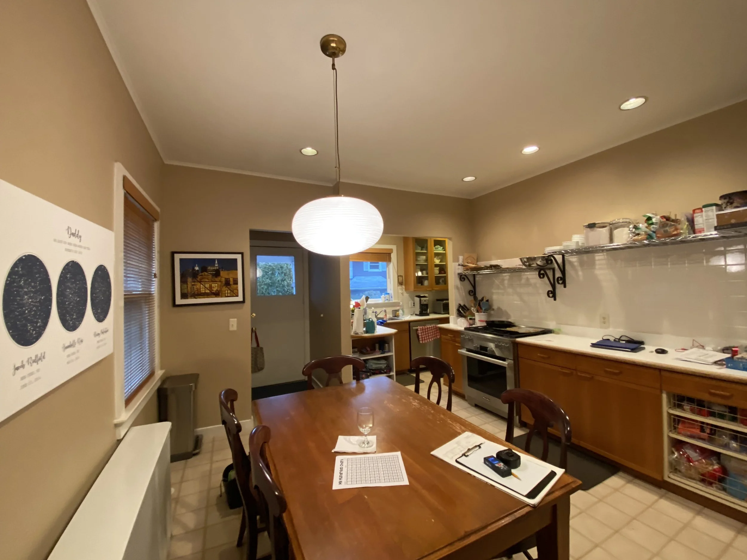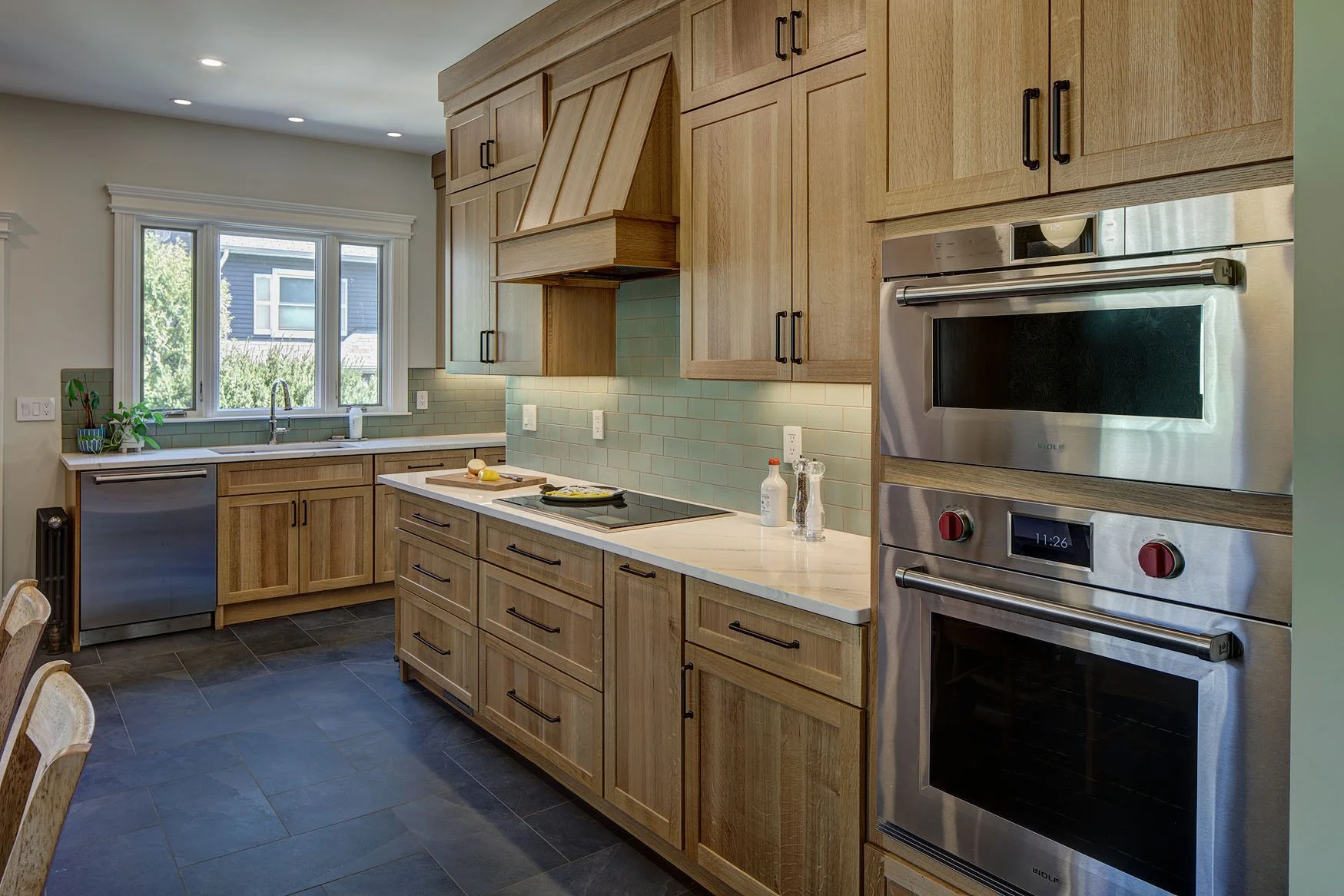 KITCHEN SOLUTION: Two principles guided the design of this family kitchen: sustainability and encouraging the independence of the 3 young children. All the space planning, and especially the cabinet storage and organization, was centered around creating a designated place for everything, and a comfy cozy seating corner. Arts and Crafts inspiration includes quartersawn oak cabinets, handmade backsplash tile, vintage inspired pendants and whimsical wallpaper with animals hidden in foliage. And how cute are those taco dinos?