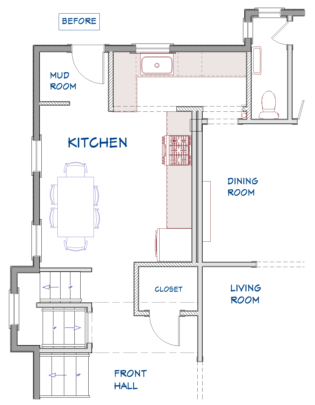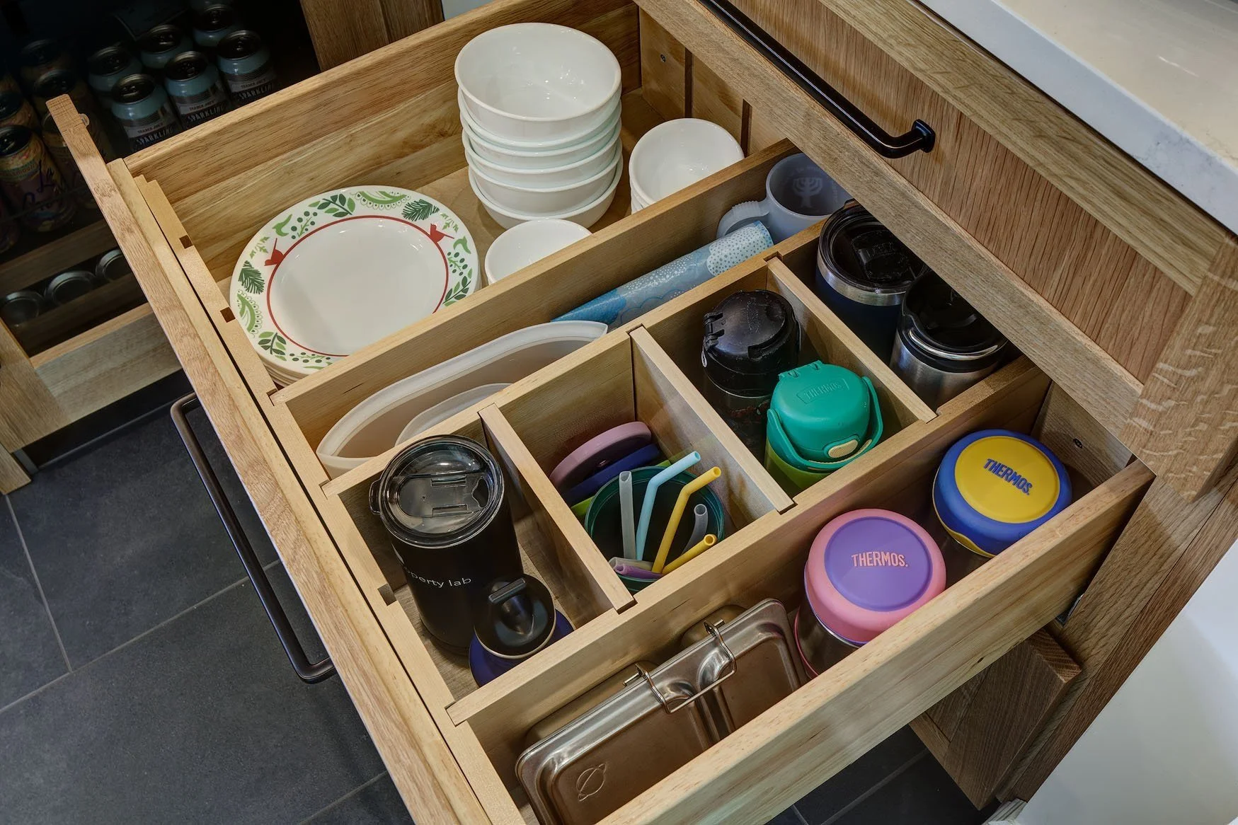 The clients reported: βThe kitchen is so well designed that there is enough storage space for everything (no more clutter!), enough counterspace to work and it feels good to be in here. Our oldest, who *never* sits down while he eats (to our dismay), is actually sitting on the banquette during meals.β