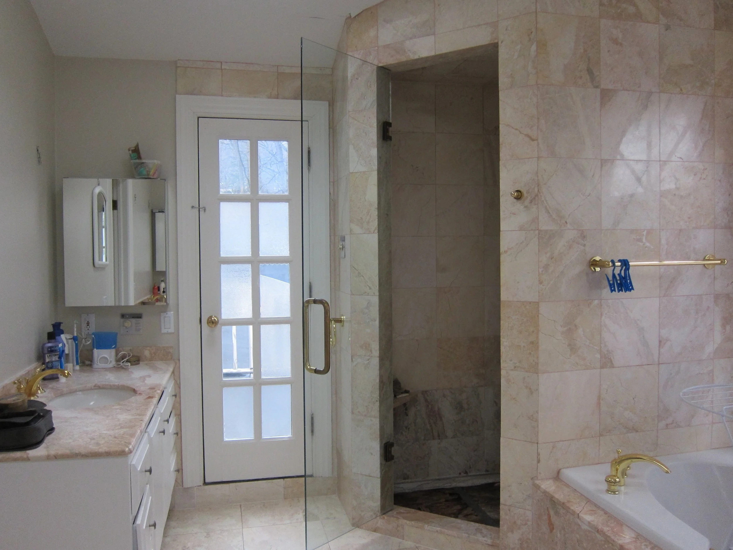 PRIMARY BATH PROBLEM: Leaking dark shower, unwanted whirlpool tub, dated style, dim lighting, colliding bath and closet doors.